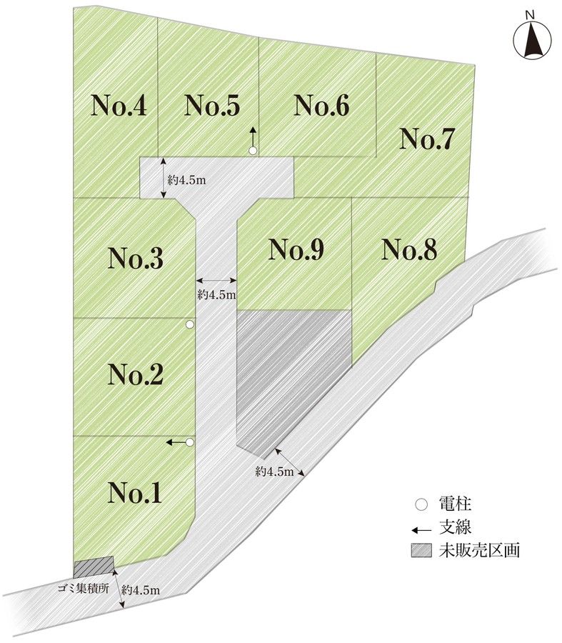 - 建ぺい率(%):60%(No.2・4・5・6・7・8)、70%(No.1・3・9)角地緩和含む ・ 容積率(%):180