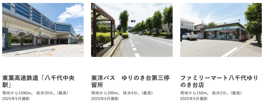 最寄バス停「ゆりのき台第三」停留所まで徒歩4分(最長)、「東洋バス」に乗車、東葉高速鉄道「八千代中央」駅まで7分