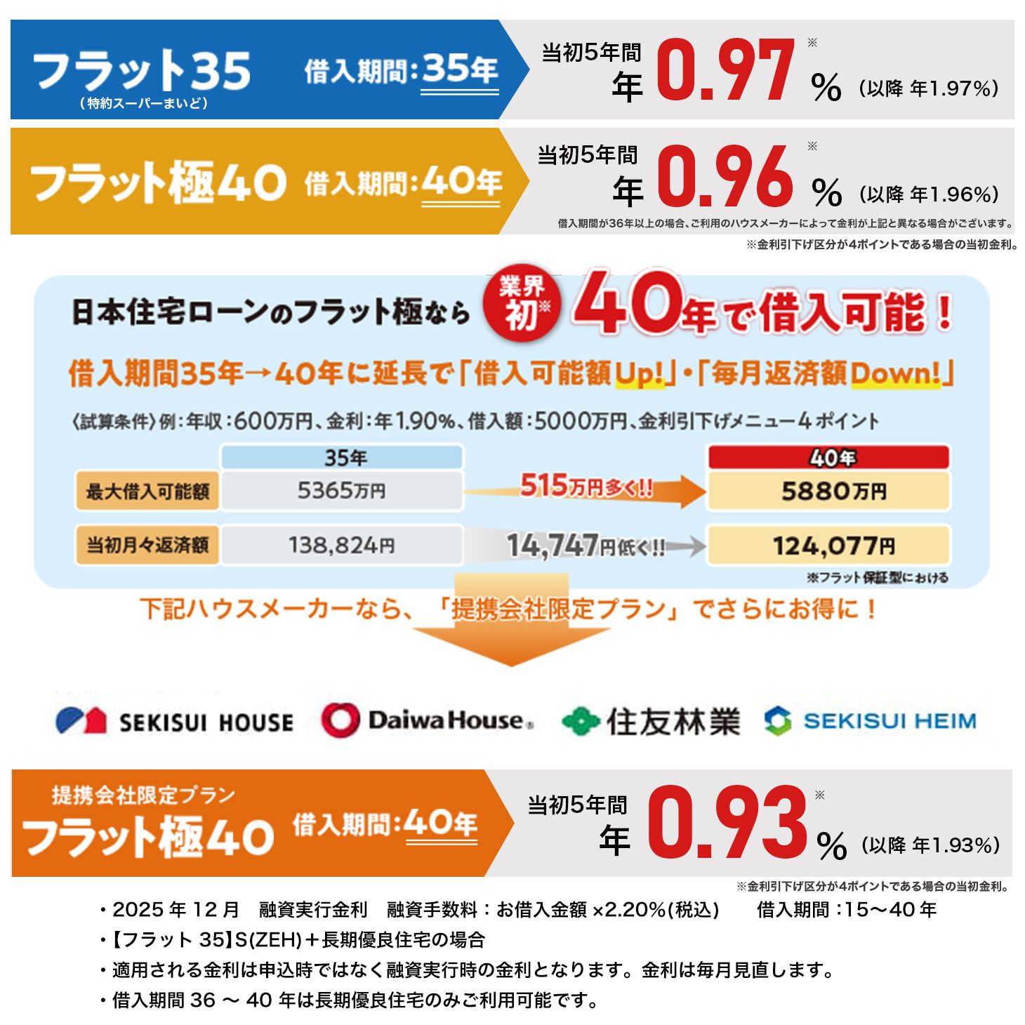 MCJ機構買取型ローン・商品概要(2025年12月 融資実行時例/新規借入の場合)【申込時年齢】お申込時の年齢が満70歳未満の方◆MCJフラット50の場合、満44歳未満の方【融資対象となる住宅・土地】■住宅の床面積について、一戸建て住宅の場合は70㎡以上、共同住宅(マンションなど)の場合は専有面積が30㎡以上【融資金額】100万円以上8,000万円以下(1万円単位)で物件取得所要金額の90%以内■MCJフラットパッケージローンをご利用の場合、MCJ機構買取型ローンを物件取得所要金額の90%(8,000万円を超える場合は8,000万円)借入することが必要■2022年1月31日以前の申込分でMCJフラット20/35の場合、100万円以上8,000万円以下(1万円単位)で物件取得所要金額の100%以内【返済期間】次の①または②のいずれか短い方が上限となります①【MCJフラット35】【MCJフラット20】の場合、15年以上35年以下(1年単位)[返済回数179回~419回](ただしお申込本人または連帯債務者の年齢が60歳以上の場合は10年以上[返済回数119回~])【MCJフラット50】の場合、36年以上50年以下(1年単位)[返済回数431回~599回]②完済時の年齢が満80歳となるまでの年数(親子リレー返済の場合は連帯債務者の年齢を基準とします)【金利】固定金利型 (実質年率 年15.0%以下)■融資実行時の金利を適用(借入申込時の金利ではありません)■融資期間20年以下の場合は、低金利設定あり。■融資期間36年以上の場合は、融資金利が異なります。■2022年2月1日以降の申込分の場合、団体信用生命保険の加入の有無・種類等により、融資金利が異なります。■2022年1月31日以前の申込分の場合、融資金額が物件取得所要金額の90%以下か、90%超か、団体信用生命保険の加入の有無・種類等により、融資金利が異なります。【融資実行日】融資実行は検査機関による建物竣工時の検査に合格後、毎月3日~19日、21日~末日のうち当社が指定する日。ただしMCJ立替払契約の利用により随時実行可能(銀行休業日は除く)【返済方式】■元利均等返済毎月払いまたは元金均等返済毎月払い ■6カ月毎のボーナス払い[融資金額の40%以内(1万円単位)]も併用可能【担保】■融資対象となる住宅及びその敷地に、住宅金融支援機構を抵当権者とする第1順位の抵当権を設定【延滞損害金】年率14.5%【団体信用生命保険】■原則、機構団体信用生命保険へ加入(A02-b 20250601)