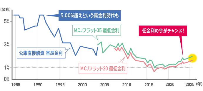 「2年待てるローン(MCJフラット極40)」を利用することで、金利情勢の影響を受けることなく、当初はお得なフラットをご利用いただくことができます。
