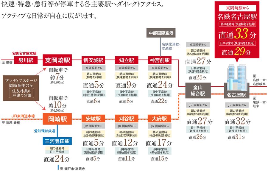 各地とつながる、「名鉄」「JR」「愛知環状鉄道」の3路線が利用可能