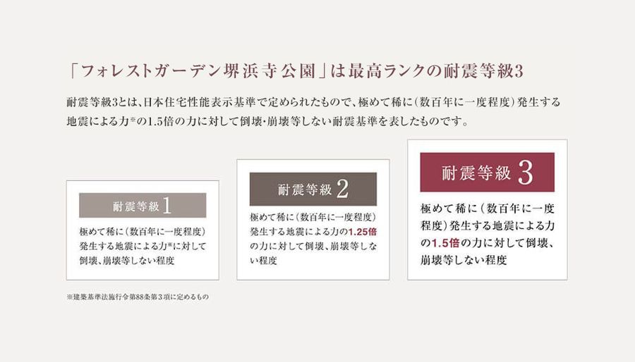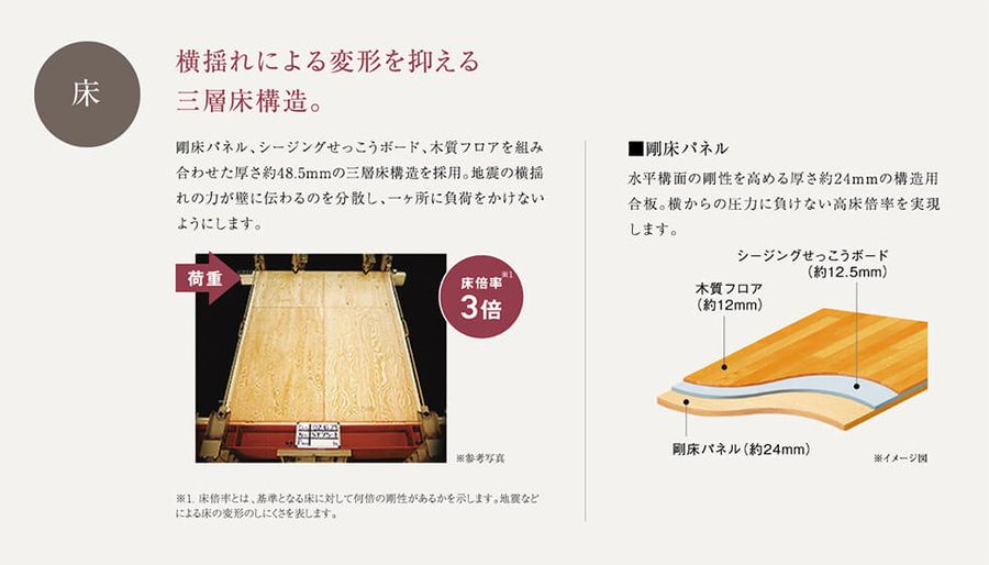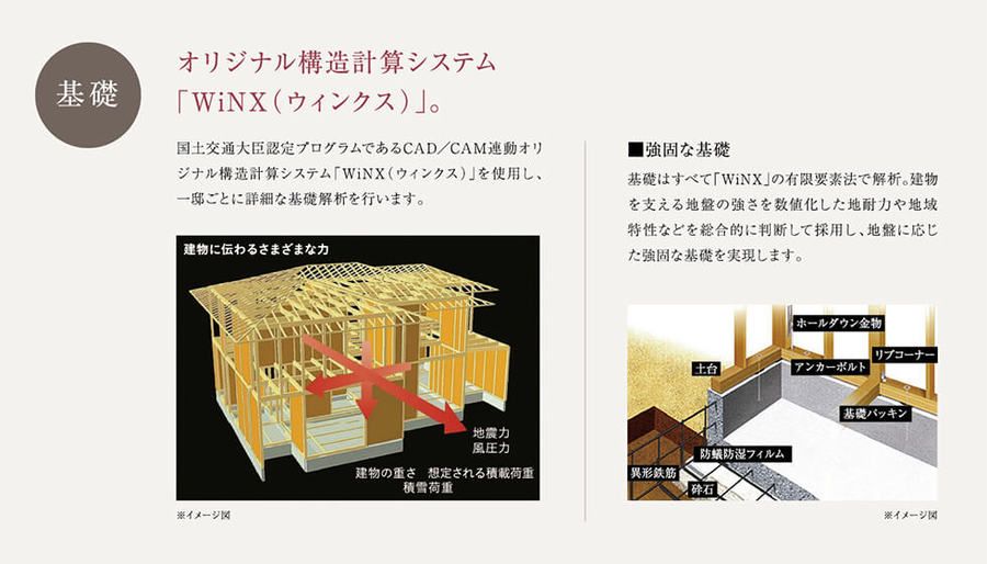 構造は最も高い構造基準の耐震等級3を取得し、全戸長期優良住宅の認定を受けており、構造躯体と防水を60年にわたり保証が可能で(※1)、30年までは定期点検も無料でサポートします(※2)。防蟻は10年目でメンテナンスが必要ですが、それ以外のメンテナンスが不要という会社は非常に少ないですし、メンテナンスが不要な住まいを最初から提供しているという自信がある証でもあります。住んでからのコストを抑えられ、安心して暮らしていただけます。