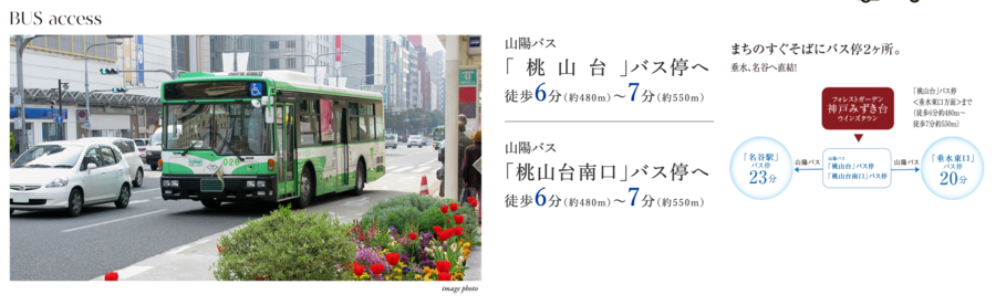 JR「垂水」駅へバス乗車20分、山陽バス「桃山台」バス停へ徒歩6〜7分、「垂水東口」バス停徒歩5分
