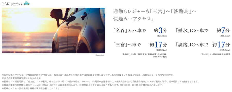 ※バス停へ徒歩6~7分、JR神戸線「垂水」駅へバス20分・下車徒歩5分。バス停へ徒歩6~7分、神戸市営地下鉄西神・山手線「名谷」駅へバス23分・下車徒歩1分。バス停へ徒歩6~7分、山陽電鉄本線「山陽垂水」駅へバス16分・下車徒歩5分。
