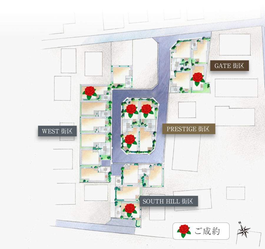 接道・道路幅員 南側公道約6.5m、北側公道約6.68m(セットバック含む)、街区内新設道路約5~6m、歩行者通路約2m(アスファルト舗装)