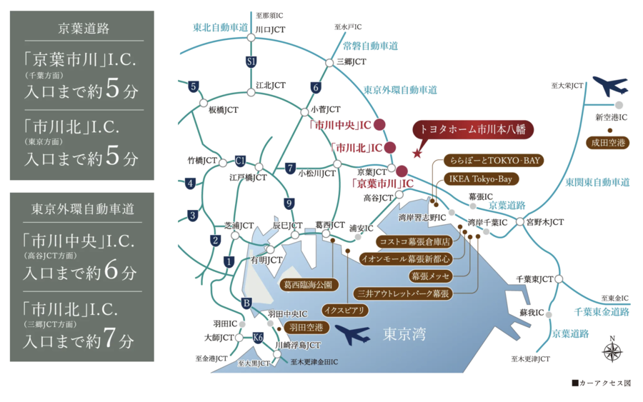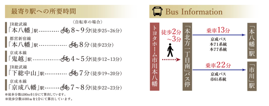- JR総武線「本八幡」駅までバス13分乗車「本北方一丁目」バス停徒歩2分~3分