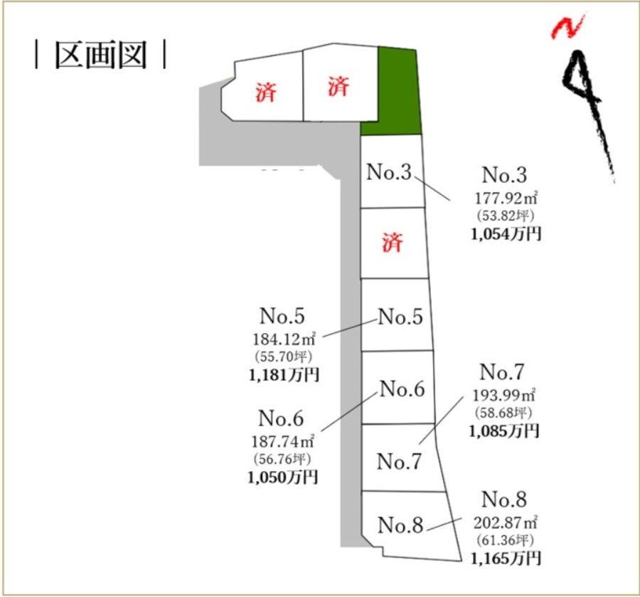No.3 土地面積 177.92㎡(53.82坪) No.5 土地面積 184.12㎡(55.69坪) No.6 土地面積 187.74㎡(56.79坪)