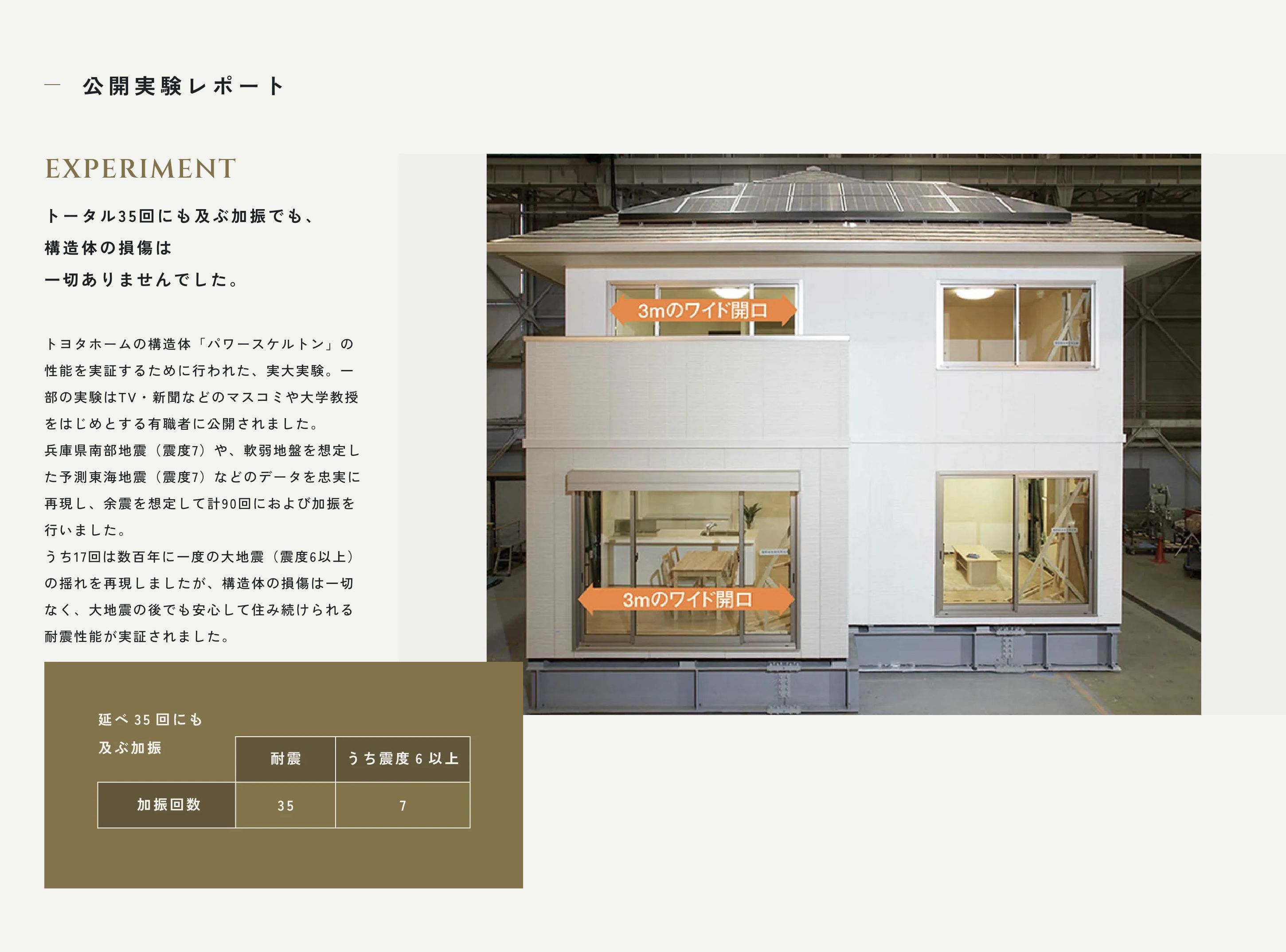 実大実験で震度7クラスの大地震を再現。構造体の損傷は一切なく、安心して住み続けられる耐震性能が実証されました。