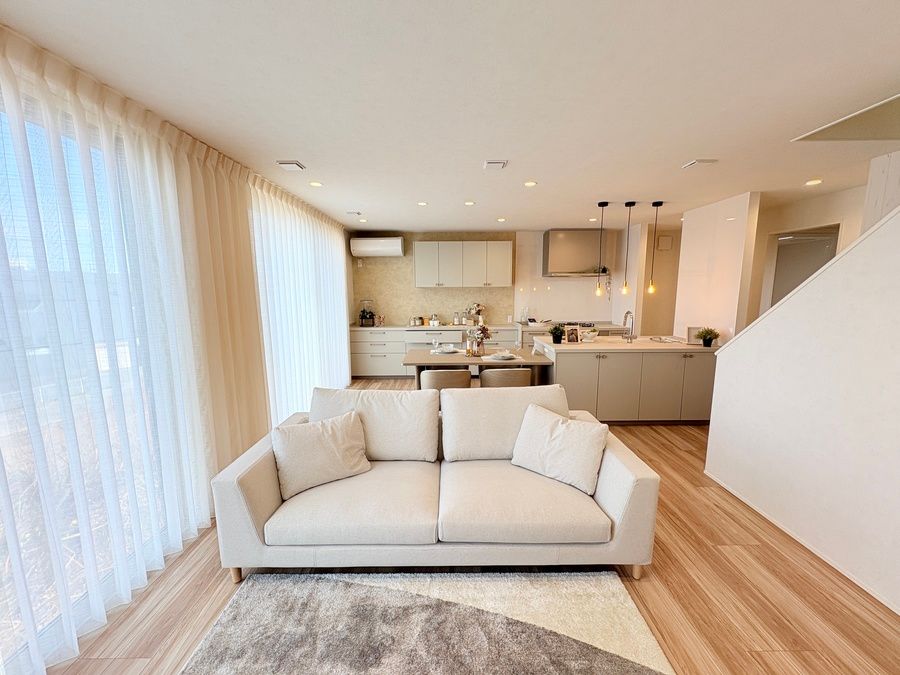 吹抜けがある開放的なLDK。モダンなインテリアに仕上げております。収納も多く、部屋がスッキリ見える使い勝手の良い家に仕上がっております。